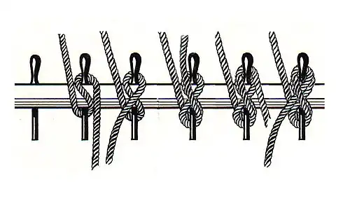 Tourner des écoutes sur un cabillot s'effectue par une série de deux tours en huit passant par l'extrémité supérieure et inférieure. Un dernier tour complète le nouage par une demi boucle inversée pour bloquer le cordage.