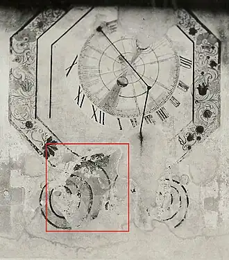 Une série de photographies datant de 1975[4] montre que la fresque a subi plusieurs restaurations successives. La plus ancienne mention écrite connue concernant le cadran solaire date de 1906[5]. Elle évoque une modification du dispositif en 1848 : le cadran solaire aurait été rapporté sur la fresque plus ancienne.