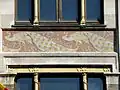 Les trois travées centrales possèdent trois sortes de sgraffites. Sur l'entablement, sous la balustrade couronnant la façade, se logent trois suites de huit sgraffites rectangulaires représentant des fleurs stylisées et séparées par des figures sculptées dans la pierre. Au tympan des trois triplets du deuxième étage, les trois sgraffites centraux sont ornés de ramages stylisés de type Art nouveau de couleur orangée sur fond rouge-brun auxquels répondent trois mosaïques faisant figurer chacun deux paons blancs sur fond brun logés des allèges entre les premier et deuxième étages.