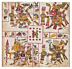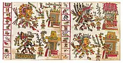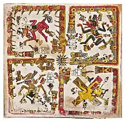 Symbolisées par des couleurs, chargées d’attributs divers et traversées par des phénomènes naturels[note 1], les 4 grandes directions ou points cardinaux étaient représentées dans l’ordre suivant : l’Est en haut du plan horizontal, le Nord à gauche, l’Ouest en bas et le Sud à droite[15]. Ces espaces orientés jouaient un rôle essentiel dans les conceptions cosmologiques des anciens Mexicains. À l'image du Soleil qui monte dans le ciel, atteint son apogée, avant de redescendre pour disparaître, ils fournissaient la représentation et les lieux de tout ce qui sur terre croît et décroît (végétation, vie humaine, astres, etc.)[16]. Plusieurs manuscrits représentent ces espaces en leur associant des divinités qui y séjournaient. Mais, selon l'origine des codex et les auteurs qui les ont interprétés, ces corrélations varient sensiblement. Par exemple, certains spécialistes en proposent toute une liste alors que d'autres, comme Durand-Forest, se limitent à deux entités principales (Tlaloc et Tlazolteotl) qui, du fait de leur conception quadruple ou quintuple (croyance selon laquelle elles étaient susceptibles d'incarner d'autres divinités) pouvaient être assignées à l'ensemble des 4 grandes directions[17].