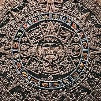 Le calendrier aztèque, ou mexica, était intimement lié à la mythologie des anciens peuples de la Mésoamérique, ceux qui jadis occupaient le plateau central de l'actuel Mexique, et qui ont formé, entre nos XIVe et XVIe siècles « occidentaux », la civilisation aztèque. Fondé sur l'observation astronomique et exprimant un système de croyances chargé de représentations abstraites (divinités, symboles, numéros, couleurs, qui se combinent et se reflètent les uns sur les autres)[2], le temps « mexicain » ne se distinguait pas radicalement de l'espace conçu comme un milieu hétérogène et doué de propriétés singulières selon les orientations cardinales. De même, à la différence de nos habitudes mentales, il n’était pas perçu comme linéaire (compte long), mais s’appréhendait de manière cyclique, à travers 3 systèmes comptables parallèles et imbriqués mettant en lumière des connaissances astronomiques élaborées. Dans cette compréhension, il convient donc de parler du « système calendaire aztèque » et de ses cycles spatio-temporels divinatoire, solaire et vénusien[3].