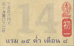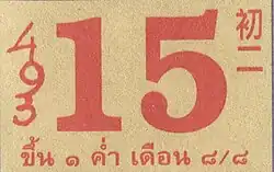 Tandis que le calendrier solaire des jours de la semaine ont des noms, les jours du calendrier lunaire sont numérotés séquentiellement de 1 à 14 ou 15 en deux segments selon que la Lune est croissante ou décroissante. Par exemple, " raem 15 kham duean 12, แรม ๑๕ ค่ำ เดือน ๑๒" signifie " Déclin de la 15e nuit du 12e mois lunaire".