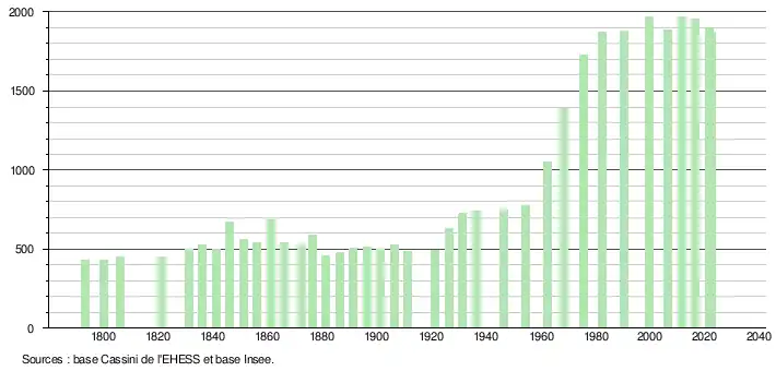 L'évolution du nombre d'habitants est connue à travers les recensements de la population effectués dans la commune depuis 1793. Pour les communes de moins de 10 000 habitants, une enquête de recensement portant sur toute la population est réalisée tous les cinq ans, les populations de référence des années intermédiaires étant quant à elles estimées par interpolation ou extrapolation[37]. Pour la commune, le premier recensement exhaustif entrant dans le cadre du nouveau dispositif a été réalisé en 2006[38].