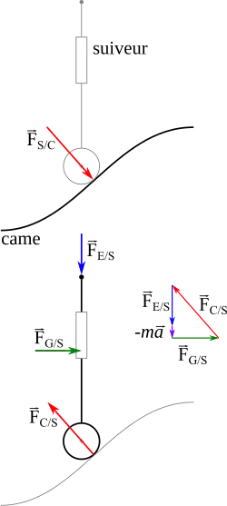 Les efforts de contact suiveur/galet dépendent de l'effort de plaquage du galet sur la came, qui est de type statique (typiquement ressort de compression), de l'effort nécessaire pour accélérer le système, et de l'éventuelle charge (si le système pilote un effecteur, un outil effectuant un travail). Si l'on néglige la résistance au roulement du galet ou le frottement de sabot ou du plateau, le vecteur force est normal au profil de la came au point de contact.