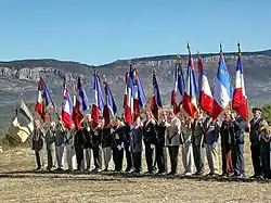 | Cérémonie annuelle du Clos d'Espargon (Camp de Canjuers). | La stèle avant son déplacement. | Le drapeau du SAP camp Lafayette. |