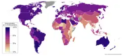 Carte de la population urbaine en 2005. L'exode rural ne s'est pas terminé dans tous les pays, notamment dans les pays faiblement urbanisés comme les PMA.
