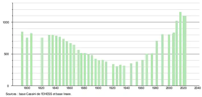 L'évolution du nombre d'habitants est connue à travers les recensements de la population effectués dans la commune depuis 1793. Pour les communes de moins de 10 000 habitants, une enquête de recensement portant sur toute la population est réalisée tous les cinq ans, les populations de référence des années intermédiaires étant quant à elles estimées par interpolation ou extrapolation[23]. Pour la commune, le premier recensement exhaustif entrant dans le cadre du nouveau dispositif a été réalisé en 2005[24].
