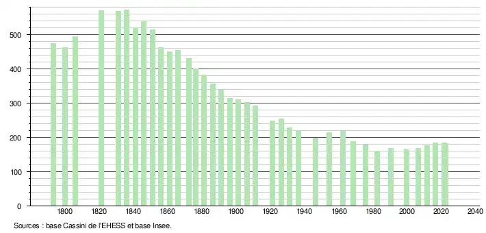 L'évolution du nombre d'habitants est connue à travers les recensements de la population effectués dans la commune depuis 1793. Pour les communes de moins de 10 000 habitants, une enquête de recensement portant sur toute la population est réalisée tous les cinq ans, les populations de référence des années intermédiaires étant quant à elles estimées par interpolation ou extrapolation[49]. Pour la commune, le premier recensement exhaustif entrant dans le cadre du nouveau dispositif a été réalisé en 2006[50].