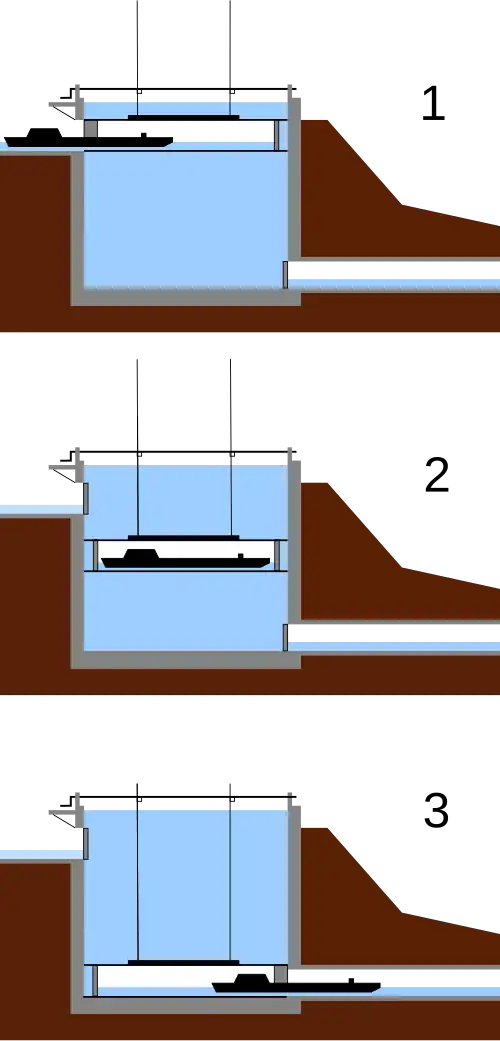 Un bateau arrive par le canal supérieur, et entre dans le caisson étanche, que l'on ferme. Le caisson est descendu au fond de la citerne à l’aide d’une crémaillère. La porte inférieure de la citerne est alors ouverte, ce qui « plaque » instantanément le caisson au niveau de sa porte contre cet orifice. La porte du caisson peut maintenant être ouverte et laisser sortir le bateau. Il suffit de refermer les deux portes et de laisser remonter le caisson pour recommencer l’opération.