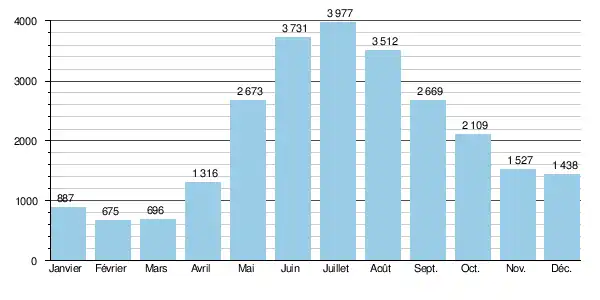 Le débit moyen mensuel observé en février (minimum d'étiage) atteint 675 m3/s, soit environ six fois moins que le débit moyen du mois de juillet (3 977 m3/s). Sur la durée d'observation de 11 ans, le débit mensuel minimal observé a été de 100 m3/s (février), tandis que le débit mensuel maximal s'élevait à 5 439 m3/s (juillet).