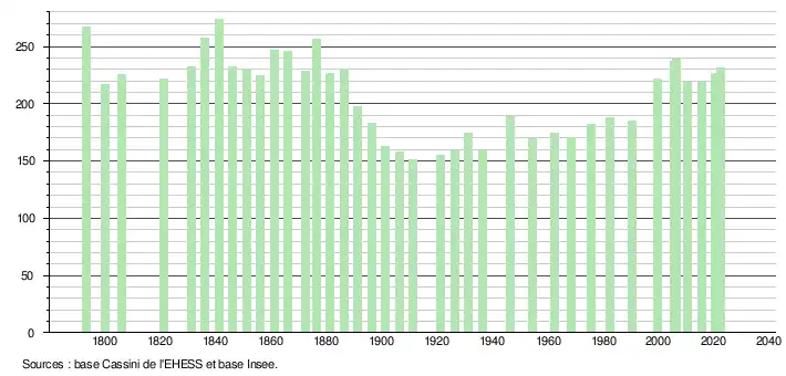 L'évolution du nombre d'habitants est connue à travers les recensements de la population effectués dans la commune depuis 1793. Pour les communes de moins de 10 000 habitants, une enquête de recensement portant sur toute la population est réalisée tous les cinq ans, les populations de référence des années intermédiaires étant quant à elles estimées par interpolation ou extrapolation[24]. Pour la commune, le premier recensement exhaustif entrant dans le cadre du nouveau dispositif a été réalisé en 2005[25].
