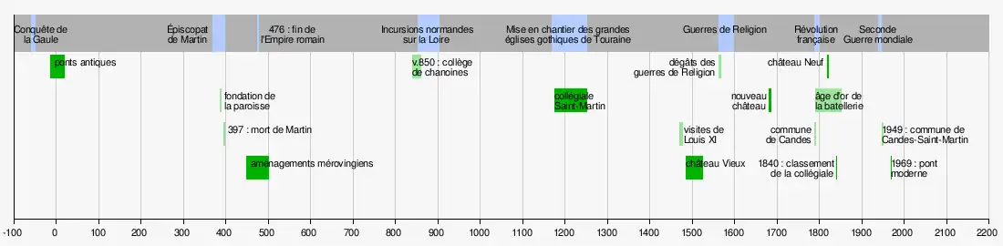 Dès le début de notre ère, une agglomération antique, probablement importante, existe sur ce site stratégique, situé au carrefour des territoires de trois peuples gaulois et contrôlant le confluent Vienne-Loire. Candes profite d'ailleurs de cette situation privilégiée : sa batellerie et les activités qui y sont liées sont longtemps florissantes, mais la disparition du transport fluvial, détrôné par le chemin de fer au milieu du XIXe siècle, marque l'arrêt du développement et la mutation progressive de la commune. À compter de cette date et jusqu'aux années 1930, la population baisse de manière très importante. Elle semble se stabiliser depuis, avec 227 habitants en 2022. C'est également vers le milieu du XIXe siècle, alors que l'économie locale est fragilisée, que des artistes, peintres ou dessinateurs, viennent à Candes pour en reproduire les paysages.