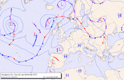 Ainsi, la dépression sur l'océan Atlantique est quasi stationnaire. Par la loi de Buys-Ballot, cela engendre l'advection d'une masse d'air en provenance du Sahara et donc un flux de sud qui gagne le sud-ouest de l'Europe le , notamment l'Espagne, où la température est montée jusqu'à 40 °C[10].