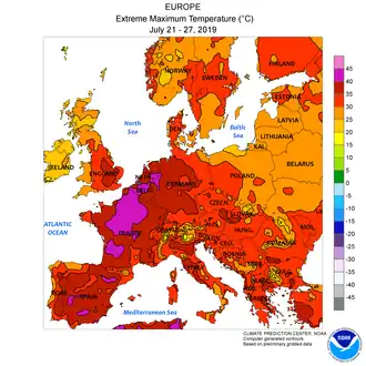 Le 27 juin est la journée la plus chaude enregistrée pour un mois de juin sur la période 1900-2019 en France avec une température moyenne de 27,9 °C (8,6 °C au-dessus de la normale)[9]. Les maximums des 26, 27 et atteignent un niveau exceptionnel de chaleur sur une large partie de l'Europe. Elles égalent ou dépassent la valeur de 35 °C. Ces trois après-midis sont les plus chauds, dans certains pays, depuis la canicule d'août 2003.