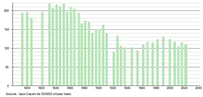 L'évolution du nombre d'habitants est connue à travers les recensements de la population effectués dans la commune depuis 1793. Pour les communes de moins de 10 000 habitants, une enquête de recensement portant sur toute la population est réalisée tous les cinq ans, les populations de référence des années intermédiaires étant quant à elles estimées par interpolation ou extrapolation[21]. Pour la commune, le premier recensement exhaustif entrant dans le cadre du nouveau dispositif a été réalisé en 2006[22].
