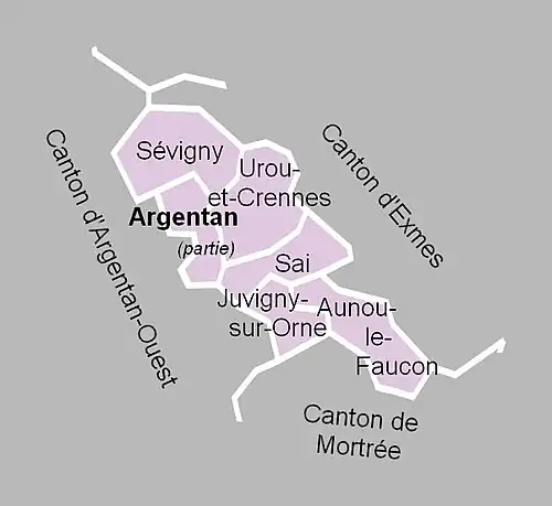 À la suite du redécoupage des cantons pour 2015, les communes d'Aunou-le-Faucon, Juvigny-sur-Orne, Sai et Sévigny sont rattachées au canton d'Argentan-1, tandis que la commune d'Urou-et-Crennes et la partie d'Argentan de ce canton sont rattachées à celui d'Argentan-2.