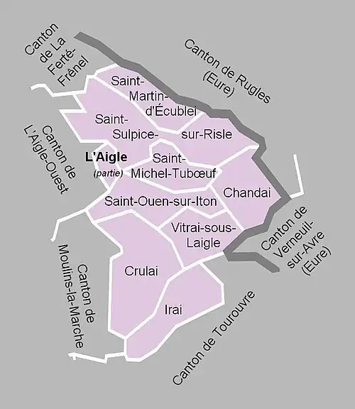 À la suite du redécoupage des cantons pour 2015, les communes de L'Aigle, Chandai, Saint-Martin-d'Écublei, Saint-Michel-Tubœuf, Saint-Ouen-sur-Iton, Saint-Sulpice-sur-Risle et Vitrai-sous-Laigle sont rattachées au canton de l'Aigle et les communes de Crulai et Irai à celui de Tourouvre.