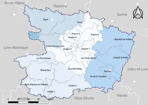| 8 | Beaufort-en-Anjou[Note 1] | Beaufort-en-Anjou | 32 551 | 6 | Baugé-en-Anjou, Beaufort-en-Anjou, Les Bois d'Anjou, Mazé-Milon, Noyant-Villages, La Pellerine. |