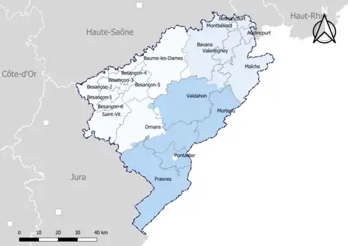 canton d'Amancey - canton d'Audeux - canton de Baume-les-Dames - canton de Besançon-Est - canton de Besançon-Nord-Est - canton de Besançon-Nord-Ouest - canton de Besançon-Ouest - canton de Besançon-Planoise - canton de Besançon-Sud - canton de Boussières - canton de Marchaux - canton d'Ornans - canton de Quingey - canton de Rougemont - canton de Roulans - arrondissement de Montbéliard (12 cantons - sous-préfecture : Montbéliard) :