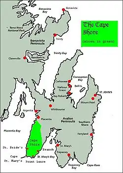 - (en) Cet article est partiellement ou en totalité issu de l’article de Wikipédia en anglais intitulé « Cape Shore » (voir la liste des auteurs).