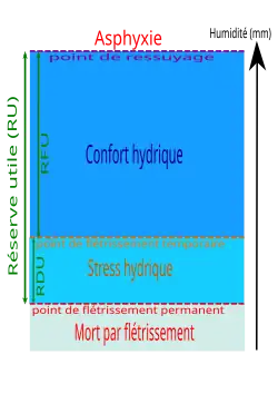 La quantité totale d'eau retenue dépend essentiellement de la texture du sol et de sa profondeur. Ainsi, par exemple, un sol argilo-calcaire d'une profondeur de 400 mm, d'une densité de 1,2 et d'une capacité de rétention de 30 g d'eau pour 100 g de terre fine et sèche retiendra :