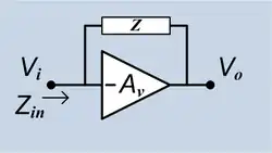 En supposant que l'amplificateur inverseur idéal de gain de la Figure 2 a une capacité parasite entre son entrée et sa sortie produisant l'impédance de contre-réaction . Si l'amplificateur lui-même a une impédance d'entrée infinie, le courant issu de la borne d'entrée et traversant vaut :