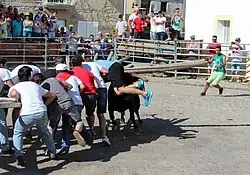 Les taureaux secouent la tête de manière provocante, dans une attitude de défi. Les portes des stalles (les " curros ") s'ouvrent, et des villageois habitués sautent dans l’arène et cherchent à faire refluer les taureaux vers les stalles à l’aide de bâtons garnis d'aiguillons, en usant de cris aigus. Et ce jeu peut durer plus d'une heure. Une fois les taureaux mis à l’abri, une nouvelle salve d’applaudissements se fait entendre.