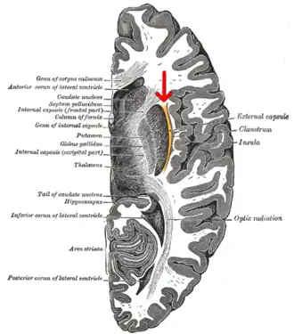 Le putamen sépare la capsule externe de la capsule interne médialement et le claustrum la sépare de la capsule extrême latéralement. Cependant, la capsule externe rejoint éventuellement la capsule interne autour du noyau lenticulaire.