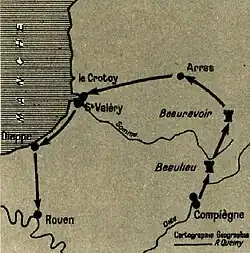 Elle est ensuite conduite à Arras, Drugy-lès-Saint-Riquier, Le Crotoy, Saint-Valery-sur-Somme, Eu, Dieppe et enfin Rouen où elle est étroitement enfermée dans une tour du château construit sur la colline de Bouvreuil.
