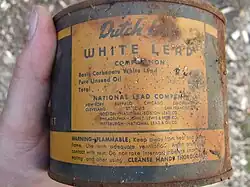 Boite de peinture blanche à base de « carbonate de plomb basique » 2 PbCO3·Pb(OH)2 et d'huile de lin ; toxique et source de saturnisme, aujourd'hui interdite