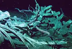 Un os de baleine récupéré sur le fond du bassin de l'île Santa Catalina (Californie, États-Unis) cinq ans après sa mise en place expérimentale. Un tapis de bactéries blanches et un crabe galathée sont présents sur l'os. Des hydrozoaires se sont installés sur la corde jaune fixée à l'os.