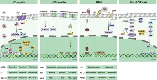 Les voies les plus importantes reconnues dans le cancer du sein, notamment la voie du récepteur des œstrogènes[47], la voie de signalisation HER2[48],[49], la voie de signalsation PI3K/AKT/mTOR[50],la voie MAPK[50],[51] et la voie cycline D1/kinase dépendante de la cycline 4/6/protéine du rétinoblastome (cycline D1/CDK4/6/RB1).