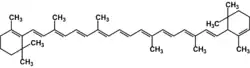 Les deux extrémités de la molécule de β-carotène sont structurellement identiques et sont appelées cycles β. Plus précisément, le groupe de neuf atomes de carbone à chaque extrémité forme un cycle β.