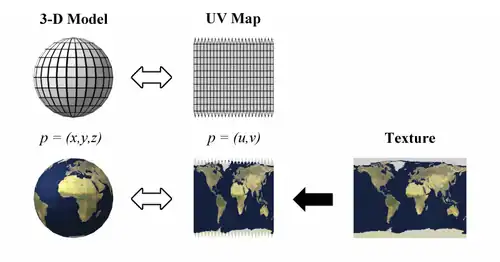 La texturation UV permet de peindre en couleurs (et autres attributs de surface) les polygones composant un objet 3D à partir d'une image ordinaire. L'image s'appelle une carte de texture UV[1]. Le processus de cartographie UV consiste à attribuer des pixels d'une image à ceux de la surface d'un polygone, généralement en copiant « par programmation » une partie triangulaire de l'image et en la collant sur un triangle de l'objet[2]. La texturation UV est une alternative au mapping de projection (par exemple, en utilisant n'importe quelle paire des coordonnées X, Y, Z du modèle ou toute transformation de la position) ; il ne fait que correspondre à un espace de texture plutôt qu'à l'espace géométrique de l'objet. Le calcul du rendu utilise les coordonnées de texture UV pour déterminer la manière de peindre la surface tridimensionnelle.