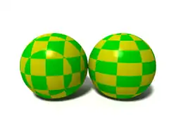 Une sphère en damier, sans (à gauche) et avec (à droite) cartographie UV (damier 3D ou damier 2D).
