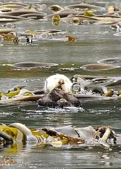 Un exemple classique de cascade trophique est celui des loutres dans les forêts de kelp. Dans les années 1970, Estes et Palmisano[8] ont étudié la structure de communautés littorales des îles Aléoutiennes. Des populations de loutres de mer (Enhydra lutris) étaient soit absentes, soit présentes dans ces communautés. En comparant la densité d'oursins (Strongylocentrotus sp.) et la végétation, ils ont observé une densité plus élevée d'oursins et un couvert d'algue faible là où les loutres étaient absentes. Étant donné que les loutres sont prédateurs des oursins et que les oursins broutent les algues, les chercheurs ont conclu que la présence de loutres contrôle les populations d'oursins, ce qui réduit l'impact de ces derniers sur les communautés d'algues.