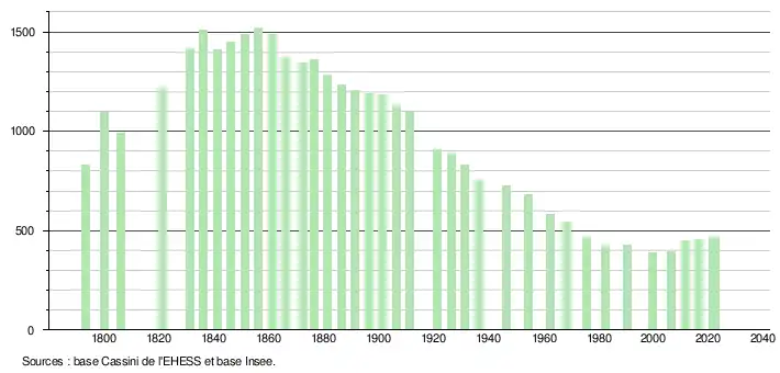 L'évolution du nombre d'habitants est connue à travers les recensements de la population effectués dans la commune depuis 1793. Pour les communes de moins de 10 000 habitants, une enquête de recensement portant sur toute la population est réalisée tous les cinq ans, les populations de référence des années intermédiaires étant quant à elles estimées par interpolation ou extrapolation[32]. Pour la commune, le premier recensement exhaustif entrant dans le cadre du nouveau dispositif a été réalisé en 2006[33].