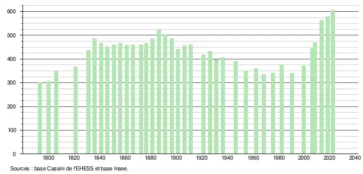 | L'évolution du nombre d'habitants est connue à travers les recensements de la population effectués dans la commune depuis 1793. Pour les communes de moins de 10 000 habitants, une enquête de recensement portant sur toute la population est réalisée tous les cinq ans, les populations de référence des années intermédiaires étant quant à elles estimées par interpolation ou extrapolation[24]. Pour la commune, le premier recensement exhaustif entrant dans le cadre du nouveau dispositif a été réalisé en 2008[25]. En 2022, la commune comptait 607 habitants[Note 2], en évolution de +4,84 % par rapport à 2016 (Landes : +5,78 %, France hors Mayotte : +2,11 %). |
