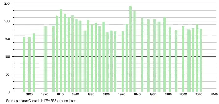 | L'évolution du nombre d'habitants est connue à travers les recensements de la population effectués dans la commune depuis 1793. Pour les communes de moins de 10 000 habitants, une enquête de recensement portant sur toute la population est réalisée tous les cinq ans, les populations de référence des années intermédiaires étant quant à elles estimées par interpolation ou extrapolation[38]. Pour la commune, le premier recensement exhaustif entrant dans le cadre du nouveau dispositif a été réalisé en 2007[39]. En 2022, la commune comptait 178 habitants[Note 5], en évolution de −4,81 % par rapport à 2016 (Haute-Garonne : +8,02 %, France hors Mayotte : +2,11 %). |