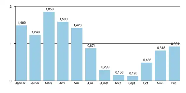 Sur cette période d'observation, le débit journalier maximal a été observé le pour 90,00 m3/s. Le débit instantané maximal a été observé le [note 3] avec 166,0 m3/s en même temps que la hauteur maximale instantanée de 496 cm soit 4,96 m[2].