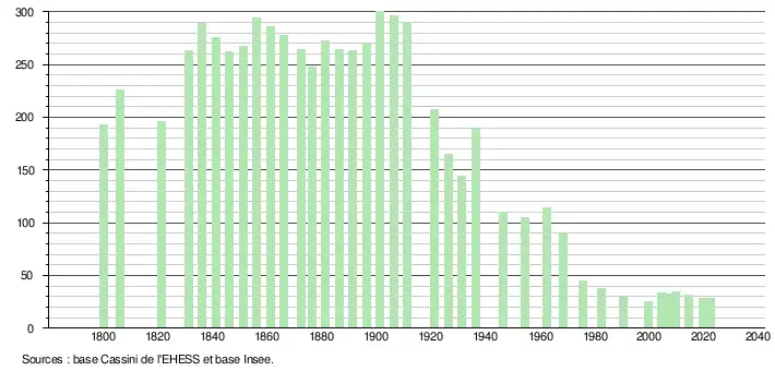 L'évolution du nombre d'habitants est connue à travers les recensements de la population effectués dans la commune depuis 1800. Pour les communes de moins de 10 000 habitants, une enquête de recensement portant sur toute la population est réalisée tous les cinq ans, les populations de référence des années intermédiaires étant quant à elles estimées par interpolation ou extrapolation[8]. Pour la commune, le premier recensement exhaustif entrant dans le cadre du nouveau dispositif a été réalisé en 2004[9].