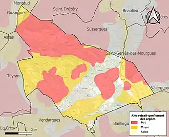 Le retrait-gonflement des sols argileux est susceptible d'engendrer des dommages importants aux bâtiments en cas d’alternance de périodes de sécheresse et de pluie. 81,4 % de la superficie communale est en aléa moyen ou fort (59,3 % au niveau départemental et 48,5 % au niveau national). Sur les 2 162 bâtiments dénombrés sur la commune en 2019, 1 089 sont en aléa moyen ou fort, soit 50 %, à comparer aux 85 % au niveau départemental et 54 % au niveau national. Une cartographie de l'exposition du territoire national au retrait gonflement des sols argileux est disponible sur le site du BRGM[26],[Carte 2].