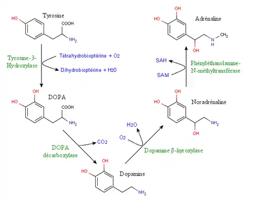 La voie de biosynthèse des catécholamines débute par l'hydroxylation d'un acide aminé, la tyrosine, capté dans le milieu extracellulaire par un système de transport actif. L'hydroxylation de la tyrosine en DOPA (dihydroxyphénylalanine) est catalysée par une enzyme, la tyrosine-3-hydroxylase, et constitue l'étape limitante de la synthèse des catécholamines. L'activité de cette enzyme est augmentée par les influx nerveux, par l'intermédiaire d'une phosphorylation dépendante de l'AMPc, des ions calcium ou du DAG (diacylglycérol), et diminuée par la DOPA et la noradrénaline. La tyrosine-3-hydroxylase utilise un cofacteur, la tétrahydrobioptérine (BH4) qui est oxydée en dihydrobioptérine (BH2) puis régénérée par l'intervention du NADH (nicotinamide adénine dinucléotide réduit) aussi appelée dihydrobioptérine réductase.