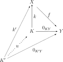 - un noyau de f est un objet K de et une flèche telle que et telle que pour tout objet de et toute flèche telle que , alors il existe une unique flèche telle que ; autrement dit le diagramme suivant commute :