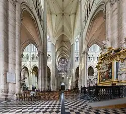 La partie la plus ancienne de l'édifice, la nef, haute de 42,3 mètres, vue depuis le triforium du chœur. Au fond, la rosace flamboyante surmontant la tribune des grandes orgues.