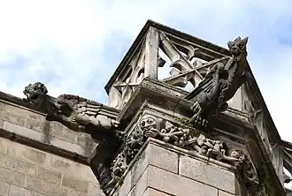 Le clocher à base carrée, décentré vers le nord, signe l'origine romane de l'édifice. Il est du XIe siècle, contemporain de la construction de la nef initiale. L'épaisse chemise qui entoure et consolide sa base depuis le XIVe siècle obture les ouvertures des niveaux romans, elle permet de supporter les quatre étages gothiques, carré pour le premier puis octogonaux pour les trois supérieurs, avec quatre contreforts sous la forme de tourelles octogonales aux quatre angles du carré. Une toiture basse couvre le dernier étage, en remplacement de la flèche en pierre détruite par la foudre en 1483[29]. Le narthex qui relie le clocher porche à la nef apparaît bas entre le clocher de 62 mètres et la façade de la nef. Cette façade est encadrée de deux tourelles octogonales encadrant la grande rosace, le pignon triangulaire, orné d'une petite rose sculptée, laisse courir à sa base une galerie ajourée en pierre, c'est la galerie supérieure qui fait le tour de l'édifice à la base du toit. De chaque côté de la nef un système double d'arc-boutant s'appuyant sur des culées[note 5] minces mais larges, surmontées de pinacles et portant les gargouilles, encadrent les chapelles latérales[note 6]. Une deuxième galerie borde les terrasses des chapelles, elle contourne par l'extérieur les culées des contreforts tout autour de l'édifice. La base des culées, plus épaisse, sépare chaque chapelle rayonnante[32].