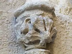 L'entrée actuelle est flanquée de deux colonnes à fûts lisses couronnées de chapiteaux composites où se retrouvent des feuilles d'acanthe et des volutes. Elle est surmontée d'un entablement à deux niveaux, l'architrave étant sommée d'une corniche à denticules. Deux pots à feu encadrent une niche à fronton triangulaire. À droite du portail, une baie gothique éclaire la nef romane une croix datée de 1805 dont le Christ fut fondu ultérieurement par les hauts-fourneaux de Rustrel, en 1851[42].