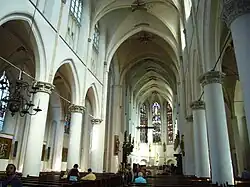 L'intérieur dépouillé dans les années 1960 de son mobilier d'origine selon la volonté du cardinal Alfrink a toutefois conservé la cathèdre[4] de l'évêque (1868), tandis que le jubé néogothique de 1872 a été placé sur le côté ouest. Les statues néogothiques en pierre calcaire de sainte Catherine, de saint Jean-Baptiste et de sainte Barbe[5] ont été replacées à l'intérieur respectivement en 1984, 1996 et 2005. On remarque douze statues (1897) de l'atelier de Mengelberg dans le sanctuaire du chœur et une statue de plâtre de saint Willibrord au-dessus de l'entrée de la chapelle de la Paix qui date du début du XXe siècle. Elle provient de l'église Saint-Willibrord d'Utrecht qui a été démolie dans les années 1970 à cause de la baisse de la pratique.