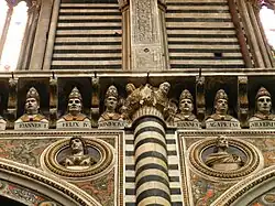 La nef centrale et le chœur sont surmontés d'un seuil surplombant une longue rangée de 171 bustes de papes, réalisés par des artistes non identifiés entre 1497 et 1502 [22]. La liste commence par Saint-Pierre, le premier pape visible à droite d'un buste du Christ au centre du mur du fond du chœur ; il se poursuit dans le sens des aiguilles d'une montre avec une succession de papes chronologiquement ordonnée et se termine par le 171e pape, Lucius III pontife de 1181 à 1185, visible à gauche du buste habituel du Christ. La liste se terminait en fait par Alexandre III (1159-1181), pape siennois qui, selon la tradition, consacra la cathédrale en 1179 ; cependant, la nécessité de destituer le pape Jean VIII, qui était confondu avec la figure légendaire et embarrassante de la papesse Jeanne, a forcé le report de tous les papes suivants d'une unité et l'ajout d'un nouveau pontife[22]. Bien que les bustes représentent des œuvres médiocres, la série est spectaculaire par sa longueur et son caractère exhaustif.