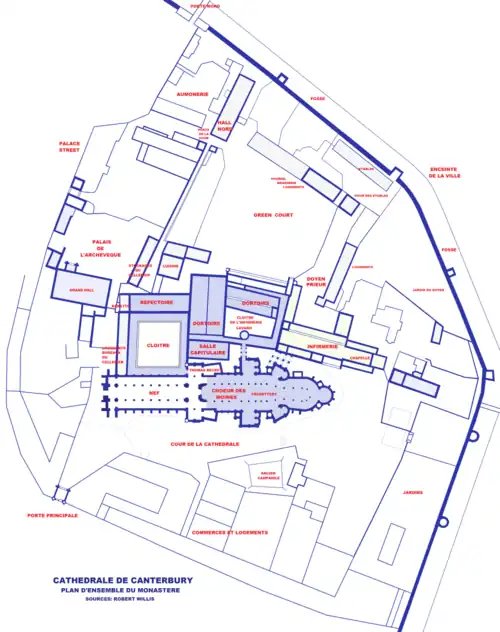 - ↑ (en) Robert Willis, « The architectural History of the Conventuel Building of the Monastery of Christ Church in Canterbury », Arcæologia Caantiana, no 7, (lire en ligne).